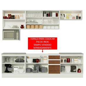 Medidas totais da cozinha: 280 cm de largura e 225 cm de altura. O balcão de pia comporta pias de 120 cm x 52 cm. Não acompanha tampo.