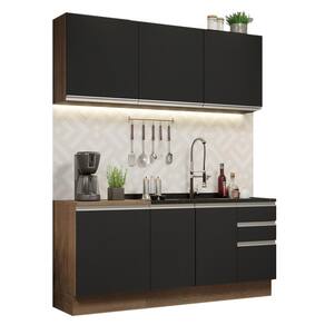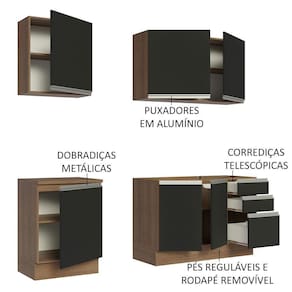 O acabamento da cozinha é no padrão amadeirado Rustic. As frentes das portas e gavetas são Pretas, partes internas das gavetas e das costas, são brancas. Feito em Pintura Poliéster ecológica, com aplicação de 7 camadas de proteção resistentes a álcool, água e calor.