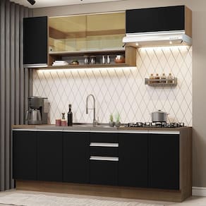 Por se tratar de uma cozinha modulada, é possível organizar os armários e balcões conforme a necessidade do seu ambiente. Com isso, se torna praticamente uma cozinha planejada.