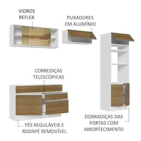 Com design atual, conta com materiais de alto padrão, como vidros reflex, puxadores de perfil total em alumínio, corrediças telescópicas nas gavetas e amortecedores para fechamento suave das portas.