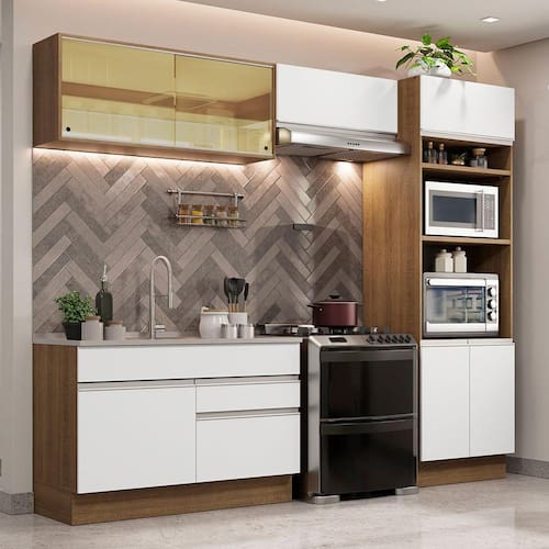 Esta cozinha pode ser complementada pelos módulos avulsos da linha Glamy da Madesa.