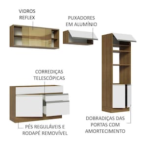 Com design atual, conta com materiais de alto padrão, como vidros reflex, puxadores de perfil total em alumínio, corrediças telescópicas nas gavetas e amortecedores para fechamento suave das portas.