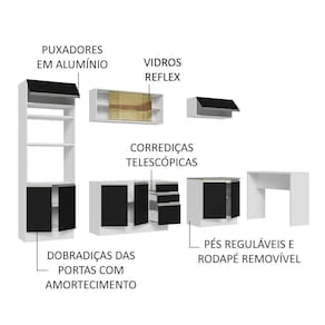 O acabamento da estrutura é branco e as portas e frentes são pretas. É feito em Pintura Poliéster ecológica com sete camadas, que destaca a tonalidade e protege o móvel.