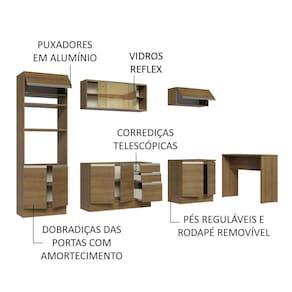 A fabricação é feita com itens de alta qualidade, como vidros reflex, puxadores em alumínio, gavetas com corrediças telescópicas, portas com amortecimento e pistão a gás para a porta basculante.