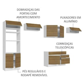 Para completar, a cozinha conta com pés reguláveis em PVC e rodapé removível em MDP de fácil encaixe, para retirar na hora de realizar a limpeza.