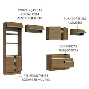 A qualidade do móvel é garantida: conta com puxadores em alumínio, gavetas com corrediças telescópicas de abertura total, portas com amortecimento e pistão a gás para as portas basculantes.