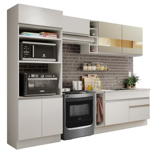 O balcão comporta pias de 120 cm x 52 cm. Não acompanha tampo para esse balcão. Além disso, todos os módulos inferiores possuem pés reguláveis em PVC e rodapé removível. A torre possui espaço para forno e micro-ondas e permite a instalação de forno embutido.
