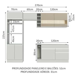 Para completar, a profundidade da cozinha é ótima, com 52 cm na torre e nos balcões inferiores e 31 cm nos aéreos. As medidas totais da Cozinha Jade são: 270 cm de largura e 225 cm de altura.