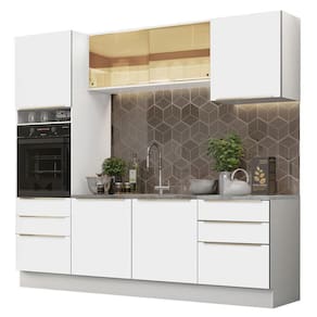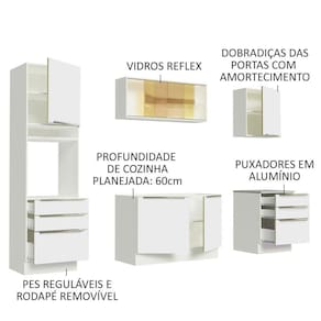 O acabamento da estrutura é branco e as portas e frentes das gavetas são em Branco Veludo. É feito em Pintura Poliéster, que consiste na aplicação de 7 camadas que protegem o móvel dos efeitos do álcool da água e do calor.