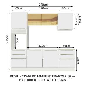 A profundidade é de 60 cm nos módulos inferiores e 31 cm nos aéreos. O balcão maior comporta pias de inox ou pedra no tamanho de 120 cm x 60 cm.
