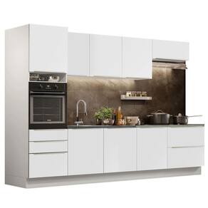 O acabamento da estrutura é branco e as portas e frentes das gavetas são em Branco Veludo. É feito em Pintura Poliéster, que consiste na aplicação de 7 camadas que protegem o móvel dos efeitos do álcool da água e do calor.