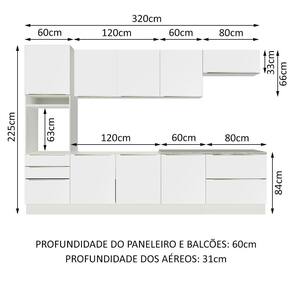 - 60 cm de profundidade no paneleiro, na torre e nos balcões e 31 cm nos aéreos