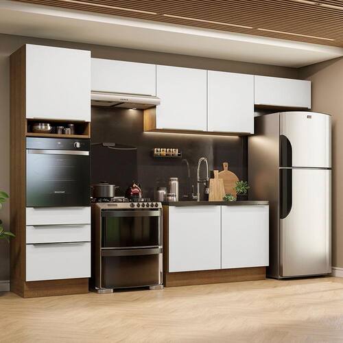 As gavetas possuem corrediças telescópicas e todas as portas contém amortecedor para o fechamento suave. Além disso, os puxadores são em alumínio, mais resistentes ao uso diário.