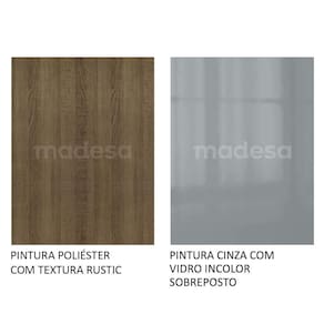 O acabamento interno e externo é no padrão amadeirado Rustic. As portas e as frentes das gavetas possuem pintura cinza. As partes internas das costas e das gavetas são brancas. A Pintura em Poliéster Protetor consiste na aplicação de 7 camadas de proteção resistentes a álcool, água e calor.