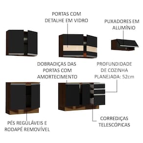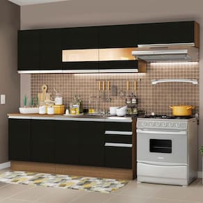 Outro grande diferencial desta cozinha é a profundidade maior, como uma cozinha planejada: 52 cm nos balcões inferiores e 31 cm nos aéreos. As medidas totais da Cozinha Madesa Marcela são: 280 cm de largura e 225 cm de altura.