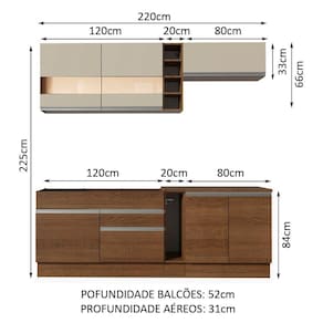 A profundidade é de cozinha planejada: 52 cm nos balcões e 31 cm nos aéreos. As medidas totais são: 220 cm de largura e 225 cm de altura.