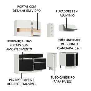 A profundidade é de cozinha planejada: 52 cm nos balcões e 31 cm nos aéreos. As medidas totais são: 220 cm de largura e 225 cm de altura.