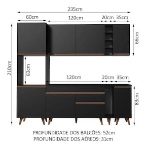 Medidas totais: - 235 cm de largura - 210 cm de altura - 52 cm de profundidade nos balcões e na torre e 31 cm nos aéreos