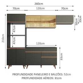 As medidas totais são: 260 cm de largura e 210 cm de altura. A profundidade é de cozinha planejada: 52 cm no balcão e na torre e 31 cm nos aéreos.
