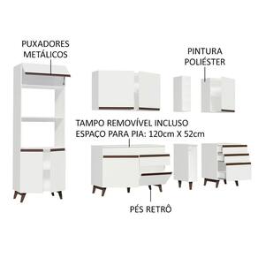 O acabamento da cozinha é branco, feito em Pintura Poliéster ecológica, que protege o móvel dos efeitos da água e do calor.