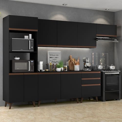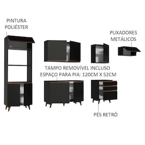 O acabamento da cozinha é preto, com exceção das partes internas das gavetas e das costas, que são brancas. O processo é feito em Pintura Poliéster ecológica de alta resistência, que dá maior destaque à tonalidade e protege o móvel.