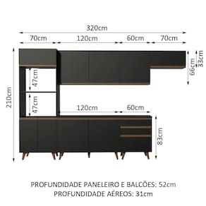 As medidas totais são: 320 cm de largura e 210 cm de altura. A profundidade é de 52 cm nos balcões e na torre e 31 cm nos aéreos.