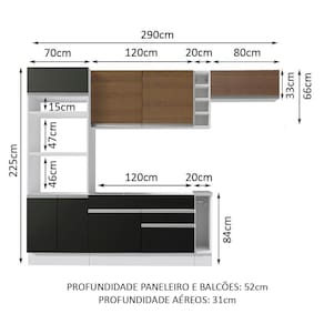 Outro grande diferencial desta cozinha é a profundidade maior, como uma cozinha planejada: 52 cm no balcão inferior e 31 cm nos aéreos. As medidas totais são: 290 cm de largura e 225 cm de altura.