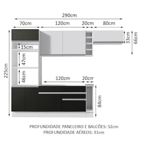 Outro grande diferencial desta cozinha é a profundidade maior, como uma cozinha planejada: 52 cm no balcão inferior e 31 cm nos aéreos. As medidas totais são: 290 cm de largura e 225 cm de altura.