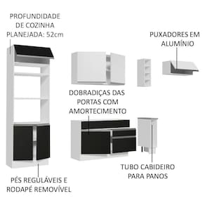 O acabamento da estrutura interna e externa é branco. As portas do aéreos são brancas e as demais portas e frentes das gavetas são pretas. Todos os acabamentos são feitos em Pintura Poliéster de alta resistência, processo ecológico e que aumenta a qualidade e durabilidade do produto.