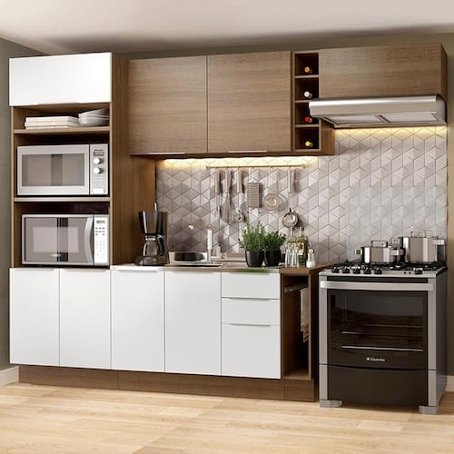 Tem espaço pra tudo neste modelo: forno, micro-ondas, garrafas, louças, eletros, panos e o que mais você imaginar. É a escolha perfeita para deixar a cozinha muito mais organizada e funcional.