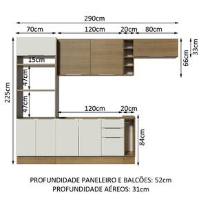A profundidade é de cozinha planejada: 52 cm nos balcões e na torre e 31 cm nos aéreos. As medidas totais são: 290 cm de largura e 225 cm de altura.