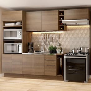 Tem espaço pra tudo neste modelo: forno, micro-ondas, garrafas, louças, eletros, panos e o que mais você imaginar. É a escolha perfeita para deixar a cozinha muito mais organizada e funcional.