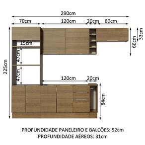 A profundidade é de cozinha planejada: 52 cm nos balcões e na torre e 31 cm nos aéreos. As medidas totais são: 290 cm de largura e 225 cm de altura.