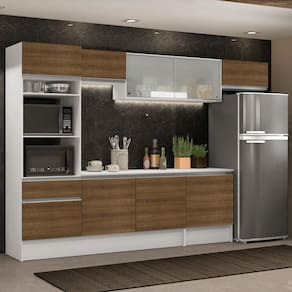 É fabricada com materiais de qualidade, como puxadores em perfil total de alumínio, dobradiças e corrediças metálicas. Além disso, os vidros no armário aéreo deixam sua cozinha muito mais elegante e sofisticada.