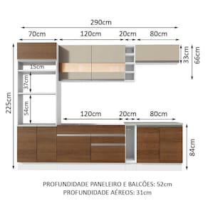 Outro grande diferencial desta cozinha é a profundidade maior, como uma cozinha planejada: 52 cm no balcão inferior e 31 cm nos aéreos. As medidas totais são: 290 cm de largura e 225 cm de altura.