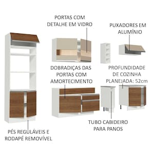 O balcão de pia comporta pias de 120 cm x 52 cm. Já o balcão para cooktop segue com tampo de 80 cm x 52 cm que pode ser recortado para a colocação do cooktop. A torre possui espaço para forno e micro-ondas e permite a instalação de forno embutido. Possui também pés reguláveis e rodapé removível.