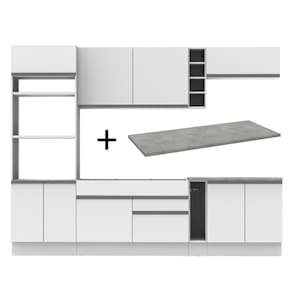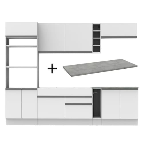 O balcão de pia comporta pias de 120 cm x 52 cm e acompanha tampo em pintura Mood. Já o balcão menor segue com tampo de 80 cm x 52 cm que pode ser recortado para a colocação do cooktop. A torre possui espaço para forno e micro-ondas e permite a instalação de forno embutido. Para completar, todos os módulos inferiores possuem pés reguláveis e rodapé removível.