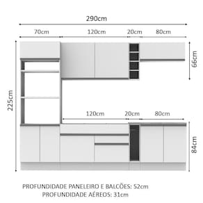 Outro grande diferencial desta cozinha é a profundidade maior, como uma cozinha planejada: 52 cm no balcão inferior e 31 cm nos aéreos. As medidas totais são: 290 cm de largura e 225 cm de altura.