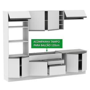 O acabamento da cozinha é branco, feito em Pintura Poliéster ecológica de alta resistência, que protege o móvel dos efeitos da água, do álcool e do calor.