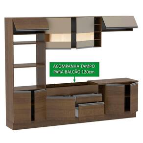 O balcão de pia comporta pias de 120 cm x 52 cm e acompanha tampo em MDP no padrão amadeirado Rustic. Já o balcão menor segue com tampo de 80 cm x 52 cm que pode ser recortado para a colocação do cooktop. A torre possui espaço para forno e micro-ondas e permite a instalação de forno embutido.