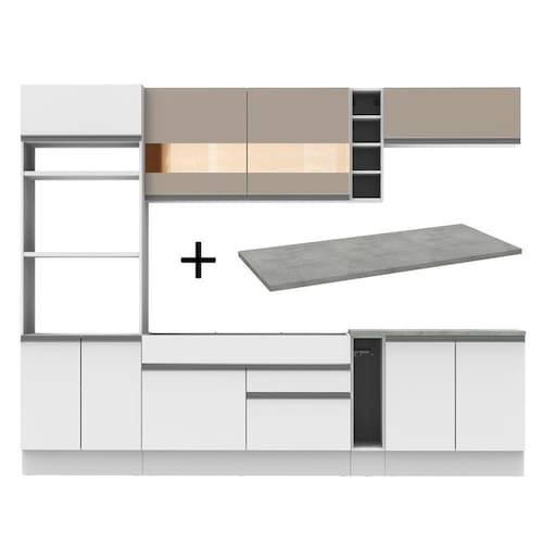 O balcão de pia comporta pias de 120 cm x 52 cm e acompanha tampo em pintura Mood. Já o balcão menor segue com tampo de 80 cm x 52 cm que pode ser recortado para a colocação do cooktop. A torre possui espaço para forno e micro-ondas e permite a instalação de forno embutido.