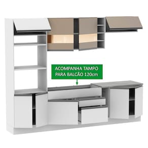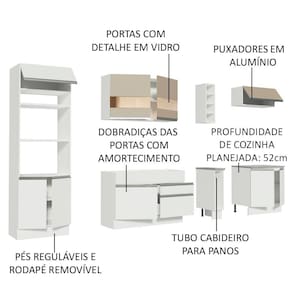 Possui também pés reguláveis e rodapé removível. Para completar, os aéreos em pintura Crema com detalhe em vidro reflex conferem muita elegância ao ambiente.