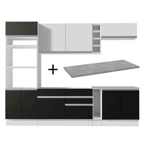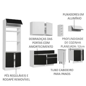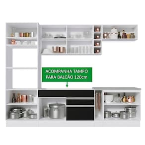 O acabamento da cozinha é todo em pintura branca, com exceção das portas da torre e das portas e frentes das gavetas do balcão, que possuem pintura preta. O processo é feito em Poliéster Protetor ecológico de alta resistência, que protege o móvel dos efeitos da água, do álcool e do calor.