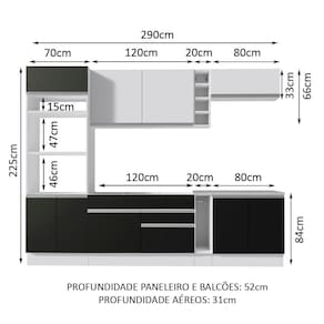 Outro grande diferencial desta cozinha é a profundidade maior, como uma cozinha planejada: 52 cm no balcão inferior e 31 cm nos aéreos. As medidas totais são: 290 cm de largura e 225 cm de altura.