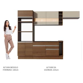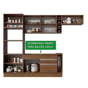 O balcão maior comporta pias de 120 cm x 52 cm e acompanha tampo em MDP no padrão amadeirado Rustic. Já o balcão menor segue com tampo de 80 cm x 52 cm que pode ser recortado para a colocação do cooktop. Todos os módulos inferiores possuem também pés reguláveis e rodapé removível. A torre possui espaço para forno e micro-ondas e permite a instalação de forno embutido.