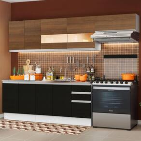 Outro grande diferencial desta cozinha é a profundidade maior, como uma cozinha planejada: 52 cm nos balcões inferiores e 31 cm nos aéreos. As medidas totais da Cozinha Madesa Marcela são: 280 cm de largura e 225 cm de altura.