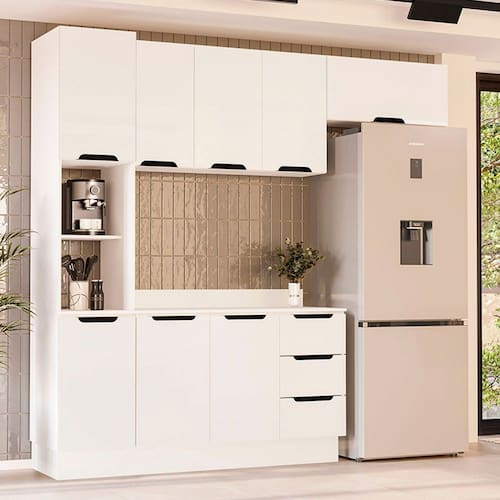 O(a) Cozinha Completa Meena 8 Portas 3 Gavetas 40250072 Branco - Politorno é produzido em MDF e MDP na escala de brilho Semi-Fosco, e possui um grau de dificuldade de montagem: Médio.
