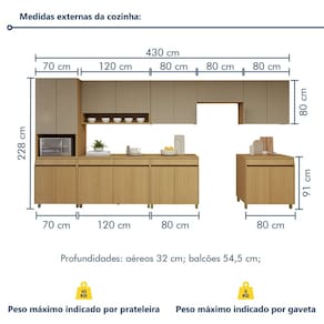 Os balcões suportam eletrodomésticos? Sim, são resistentes para micro-ondas, cafeteira e outros itens. Acabamento da Prateleira: Impressão Escala de Brilho da Prateleira: Semi-Brilho Acabamento da Gaveta: Impressão Escala de Brilho da Gaveta: Semi-Brilho Acabamento da Porta: Impressão Escala de Brilho da Porta: Semi-Brilho Acabamento dos Pés: Pintura Acompanha Rodapé Decorativo: Não Acompanha Tampo: Sim Altura dos Pés: 10 cm Altura Máxima dos Pés: 10.0000 Ambiente Principal: Cozinha Balcão Suporta Pia: Não codigo_ean: 7900288224705 Complexidade da Montagem: Alta: deve ser montado por um montador especializado Cor: Marrom Cor do Produto: Marrom Cor Interna: Carvalho/Greige Escala de Brilho: Semi-Brilho Espessura do Tampo: 30 mm Gaveta com Chave: Não Informações Complementares: Tampo 30mm; dobradiça 35mm e conforto tecnológico slow motion; Fundo dos armários de Duratree,produto super-resistente e anti-mofo. Itens Inclusos: 1 Cozinha Completa, Kit Ferragens e Manual de Montagem Manual de Montagem e Instalação: https://product-hub-prd.madeiramadeira.com.br/943555132/documents/64610699-f1c4-4391-8d1c-91b2cf9e5b3d318266373217569840934664.pdf Marca: Nesher Móveis Material da Corrediça: Metálica Material da Dobradiça/Corrediça da Porta: Metálica Material da Gaveta: MDF Material da Porta: MDF Material da Prateleira: MDF Material do Fundo: Duratree Material do Tampo: MDF Material dos Pés: ABS Medida de cada item (A x L x P): Ilha: 100cmx120cmx35,5 ; Aéreo 2 : 80cmx80cmx32; Aéreo Nicho: 80cmx120cmx32; Aéreo 1 Porta: 40cmx80cmx32; Balcão 80: 91cmx80cmx54,5; Balcão 120: 91cmx120cmx54,5; Balcão Cooktop: 91cmx80cmx54,5; Paneleiro: 228cmx70cmx54,5 modular: Sim Montagem Flex: Não Necessita Montagem: Sim O Balcão Acompanha Pia: Não Origem do Produto: Nacional Pés Reguláveis: Sim Peso: 369 kg Peso Máximo por Gaveta: 5 kg Peso Máximo por Prateleira: 10 kg Possui Pés: 10 Possui Portas: Sim Possui Prateleiras: Sim Possui recorte para Cooktop: Não Possui Rodízio: Não Possui Vidro: Não Produto Montado: Sim Recomendações de Uso, Manutenção e Limpeza: Utilizar pano macio levemente umedecido e na sequencia pano macio seco. Sapatas Niveladoras: Sim Sistema de Montagem: Parafusos e Cavilhas Tamanho Indicado da Pia: . Tipo de Corrediça da Gaveta: Metálica Telescópica Tipo de Dobradiça da Porta: 35 mm Tipo de Dobradiça/Corrediça da Porta: 35 mm Tipo de Puxador da Gaveta: Embutido Tipo de Puxador da Porta: Embutido Marca: Não Informado