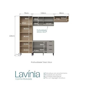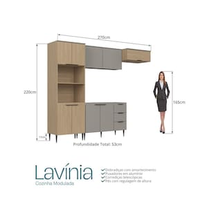 A cozinha Lavínia completa com 4 peças é uma excelente opção para quem busca praticidade, estilo moderno e funcionalidade no dia a dia. Possui um aéreo fechado. Torre quente com espaço para micro-ondas com as suas medidas A:40,5 XL 67 X P: 53 e para forno A: 40,5 X L: 67 X P: 53 cm, possui dobradiças com amortecimento, puxadores em alumínio, corrediças telescópicas e pistão a gás. Suas medidas totais 220 cm de altura 270 cm de comprimento e 53 cm de profundidade. Acabamento da Prateleira: Finish Foil Escala de Brilho da Prateleira: Fosco Acabamento da Gaveta: Finish Foil Escala de Brilho da Gaveta: Fosco Material do Puxador da Gaveta: Alumínio Acabamento da Porta: Finish Foil Escala de Brilho da Porta: Fosco Material do Puxador da Porta: Alumínio Acabamento: Finish Foil Acompanha Tampo: Não Altura dos Pés: 15 cm Ambiente Principal: Cozinha Balcão Suporta Pia: Sim codigo_ean: 7900288348784 Complexidade da Montagem: Média: pode ser montado por mais de uma pessoa e/ou necessite de maior conhecimento para montagem Cor: Imperial/Fumê Cor do Produto: Imperial/Fumê Escala de Brilho: Fosco Espessura do Material da Estrutura: 15 mm Gaveta com Chave: Não Itens Inclusos: 1 Torre Quente, 1 Balcão, 2 Aéreos, Manual de Montagem e Kit Ferragem Linha ou Coleção: Lavínia Manual de Montagem e Instalação: https://cdn2.madeiramadeira.com.br/prd/2940-0f2b3007-c50f-4128-9718-8e71c69b4cf7-1771872807.pdf Marca: j carvalho Material da Corrediça: Metálica Material da Dobradiça/Corrediça da Porta: Metálica Material da Gaveta: MDP Material da Porta: MDP Material da Prateleira: MDP Material dos Pés: Polipropileno Medida de cada item (A x L x P): Torre quente A 220 x C 70 x P 53 - Balcão de Pia A 85 x C 120 x P 53 - Aereo Basc. cook. A 28,5 x C 80 x P 53 -Aéreo madeira A 52 x C 120 x P 32 modular: Sim Necessita Montagem: Sim O Balcão Acompanha Pia: Não Origem do Produto: Nacional Pés Reguláveis: Sim Peso: 128,5 kg Peso Máximo por Gaveta: 5 kg Peso Máximo por Prateleira: 8 kg Possui Pés: 09 Possui Portas: Sim Possui Prateleiras: Sim Possui recorte para Cooktop: Não Possui Rodízio: Não Recomendações de Uso, Manutenção e Limpeza: Flanela Umedecida Sapatas Niveladoras: Sim Sistema de Montagem: Parafusos e Cavilhas Suporta Até (kg): 90 kg Tamanho Indicado da Pia: 120x53 Tamanho Indicado do Tampo: 120x53 Tipo de Corrediça da Gaveta: Telescópica Tipo de Dobradiça da Porta: Soft close Tipo de Porta: Misto (Abrir e Basculante) Tipo de Puxador da Gaveta: Externo Tipo de Puxador da Porta: Externo