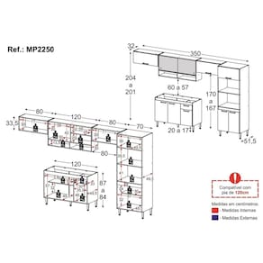 Especificações Técnicas: Dimensões do Produto Montado - Altura: 201 a 204cm | Largura: 350cm | Profundidade: 51,5cm (Balcão) - 32cm (Aéreo) Espaço para Fogão/Geladeira: Altura: 170cm | Largura: 80cm Material: MDP 15mm proveniente de reflorestamento Quantidade de Portas: 10 Quantidade de Gavetas: 1 Corrediças: Telescópicas Espaço para Forno/Micro-ondas: Sim Compatível com Pia: Sim (tampo não incluso) Pia Inclusa: Não